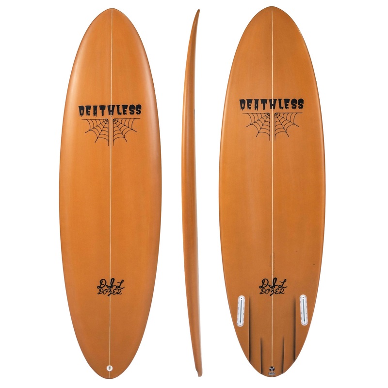 The Dildozer twin from Deathless surfboards is a snub nose, 4 channel round pin tail twin fin.