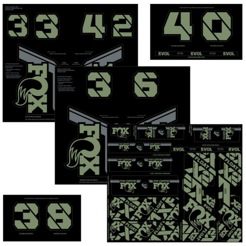 Fox Suspension Fork and Shock AM Custom Decal Kit - PistacioKits include fork and shock decals to fit almost every FOX fork and shock model.Specific decals for 32, 34, 36, 38 and 40 forks as well as DPS, FLOAT X, FLOAT X2, DHX and DHX2 shocks.One decal kit