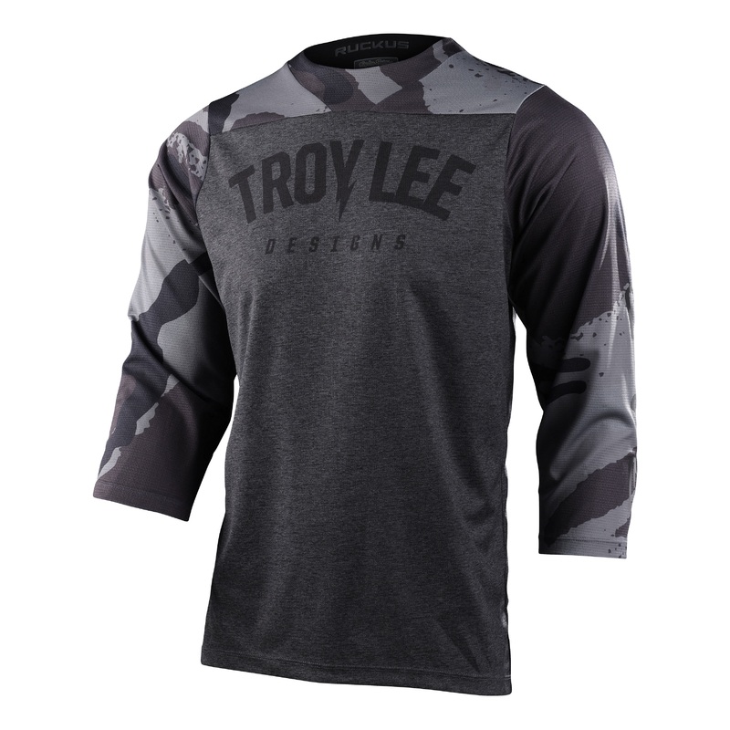 Troy Lee Designs Ruckus 3/4 Sleeve MTB Jersey - Camber Camo - Black Heather The Ruckus Streamline jersey offers improved comfort with a revised neckline and polyester knit fabric that is both lightweight and durable. The 3/4 sleeve jersey also provides amp